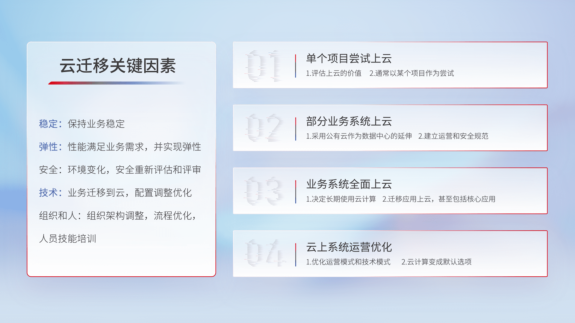 结合实际业务,,,,从规划设计、、云平台选型、、、、云原生改造、、数据迁移、、、集成交付,,迁移全过程为客户识别最佳上云路径,,,,做好风险识别管理,,设计网络架构、、身份权限、、、安全审计合规、、、操作审计、、、、日志审计、、、监控告警策略、、、、多站点容灾设计等,,对云上基础设施进行整体规划,,,提升IT治理水平,,,,以满足弹性、、、、高可用、、高性能的需求。。
